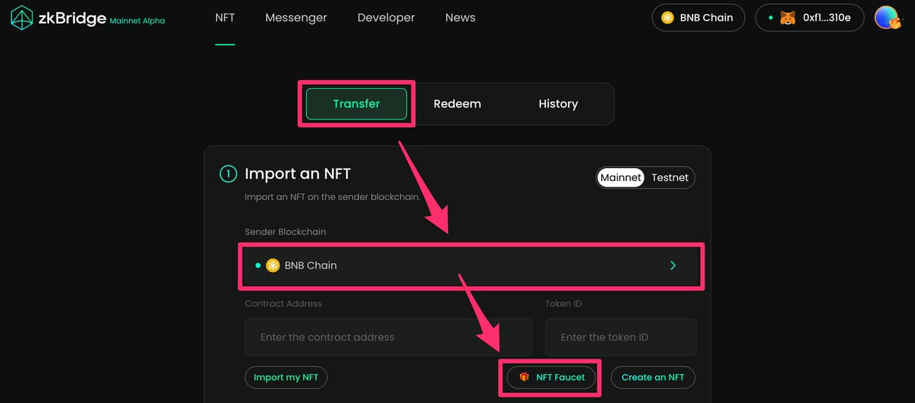「Transfer」>「BNB Chain」>「NFT Faucet」